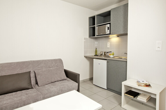 Résidence Baie des Anges is a student residence featuring furnished studios. Each apartment includes a living area with a workspace, an equipped kitchenette, and a private bathroom.